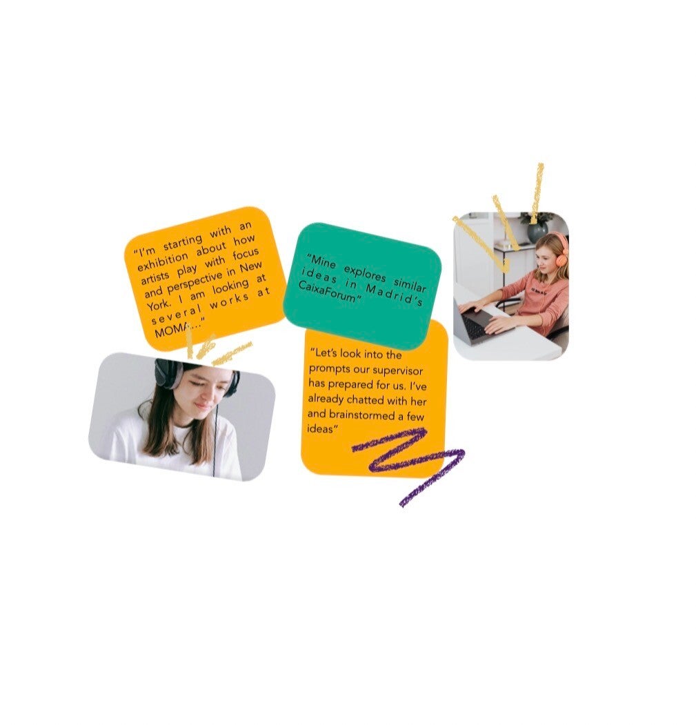 Students then follow a personalised calendar of guided research and artistic exploration while using both Spanish and English with specific objectives. Through shared prompts, reflections, and light weekend meetings, partners exchange ideas and perspectives — bridging time zones through thoughtful, flexible collaboration.